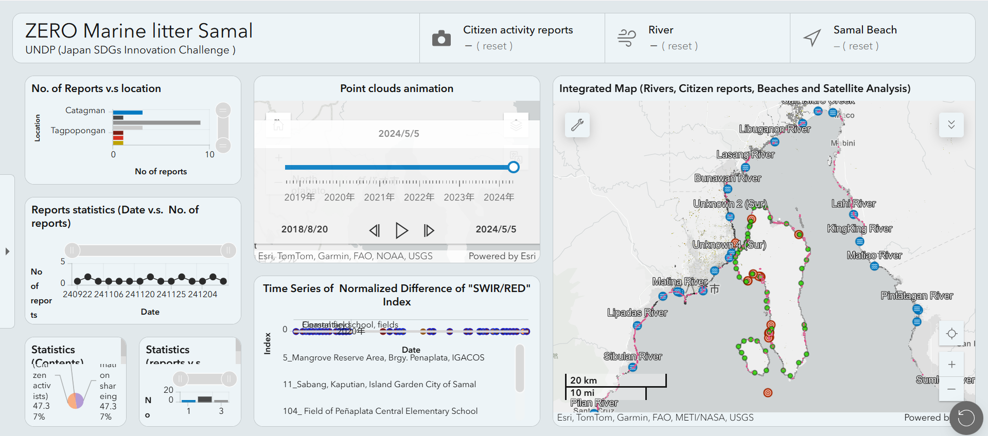 サマル島は観光業で成り立っている島ですが、近隣の都市や河川から大量に流れつくプラスチックゴミによる海洋汚染、そして観光への影響に頭を悩ましていました。プラスチックゴミ集積の分析結果はオンラインのダッシュボードでいつでも確認するができ、現地自治体の政策担当者の政策立案に活用されます。