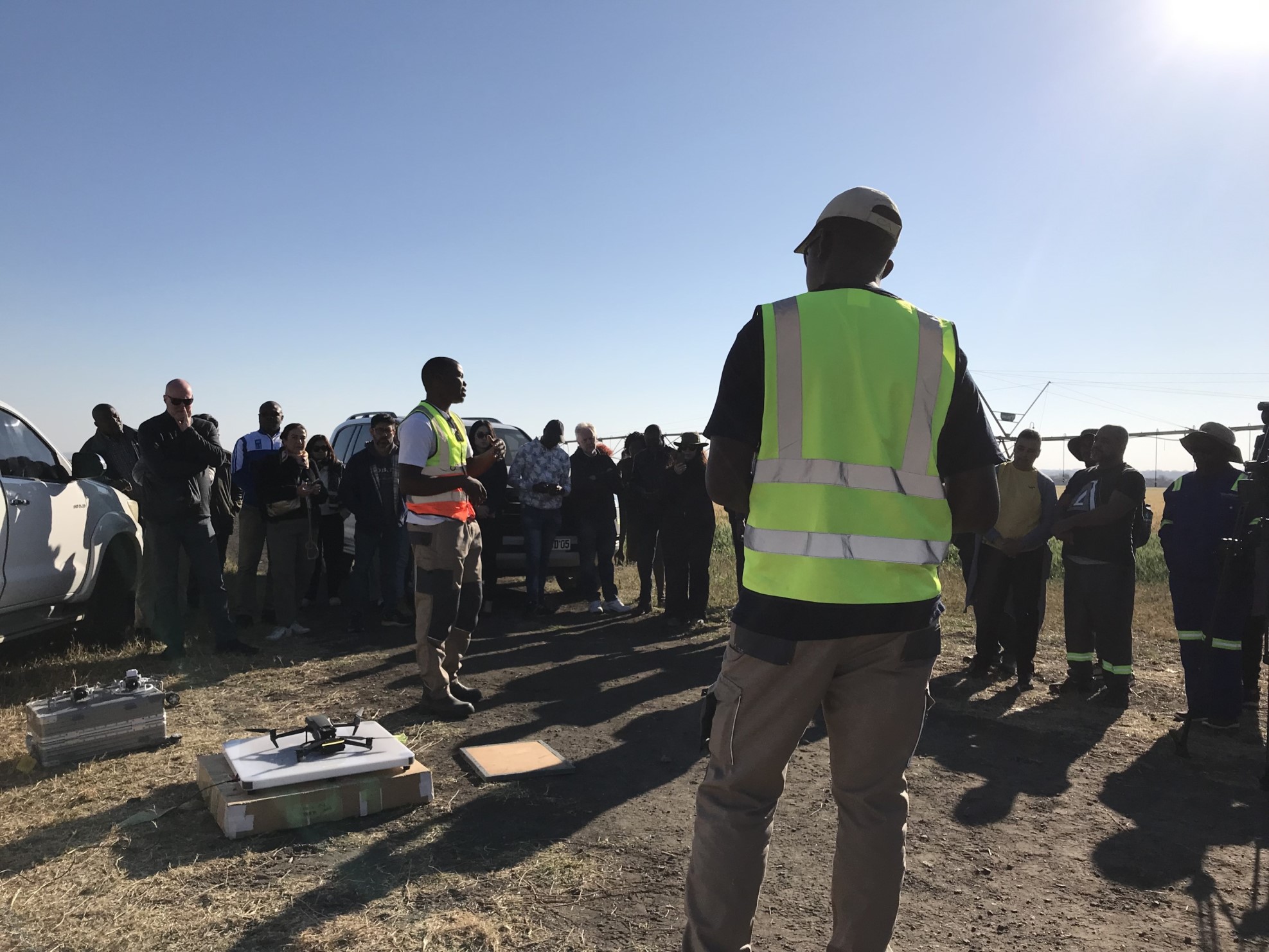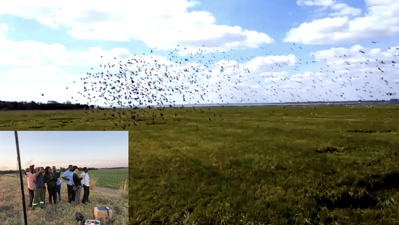 大群で飛来するコウヨウチョウの様子とドローンの操作を見守るジンバブエの人々出所)ペガラジャパン