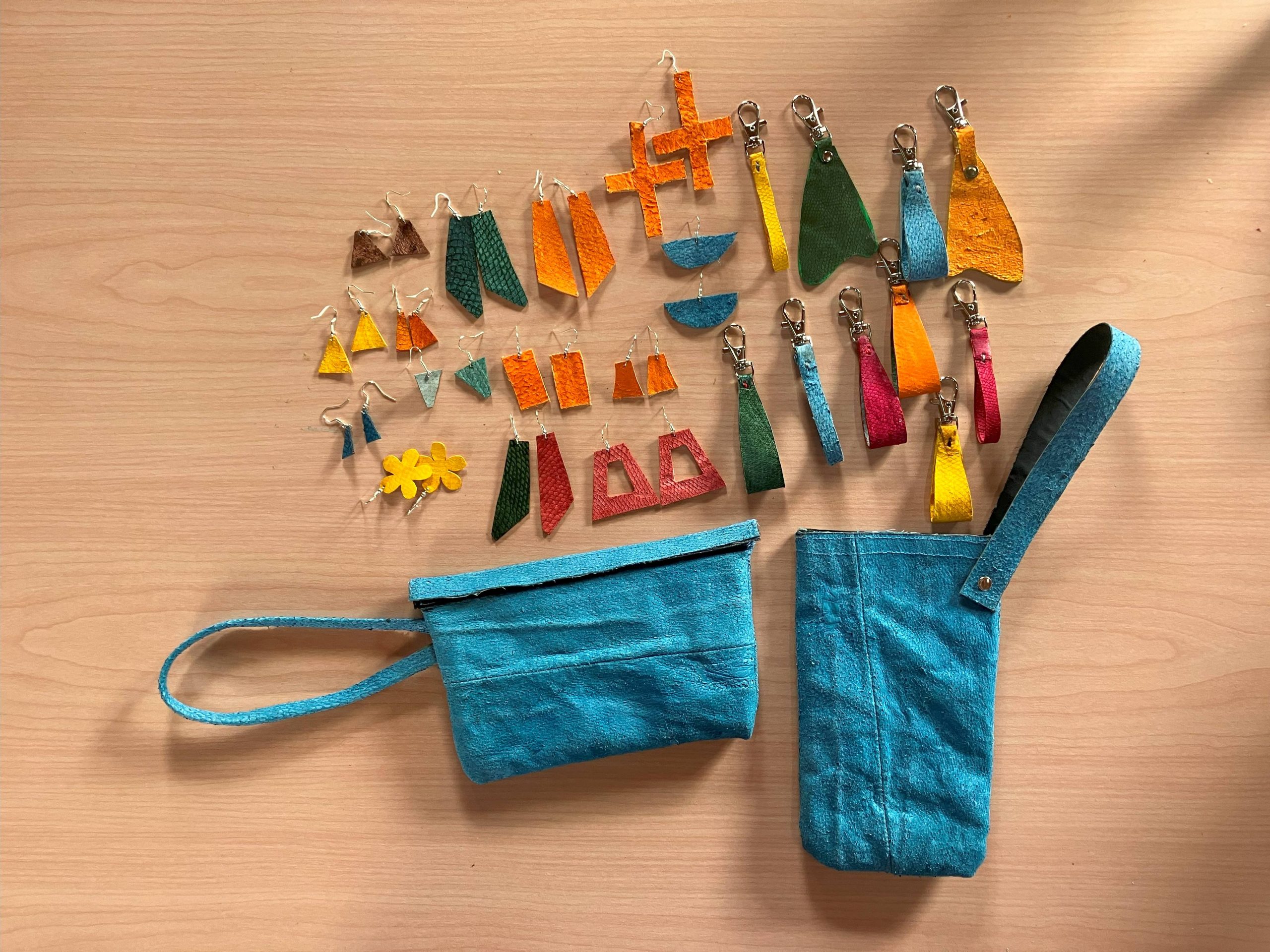 現地の人々が作成した魚の皮を使ったアクセサリーとバッグ