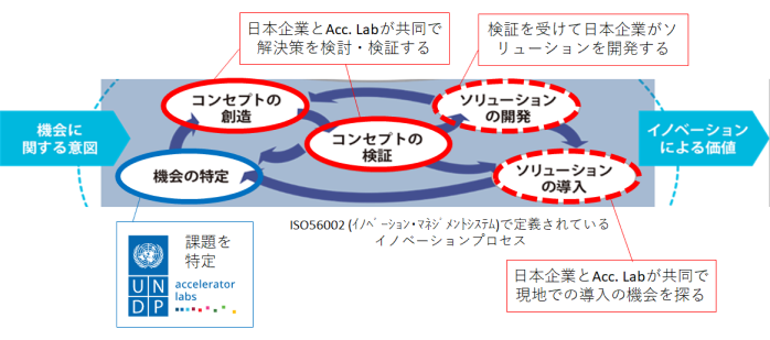 このプロジェクトの特徴は、2019年に発行されたISO 56002(イノベーション・マネジメントシステム)に定義されている“イノベーション活動のプロセス”に沿って推進していることです(下図)。当初はこのプロセスの「コンセプト(解決策)の創造」と「コンセプト(解決策)の検証」に重点を置いてきましたが、フェーズが進むにつれ、「ソリューションの開発」と「ソリューションの導入」まで踏み込み、より現地での実装に近づけています。