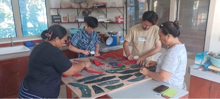 また、サモアでは、大量に破棄されてしまっている魚の皮を有効に活用するために、魚の皮をなめしてフィッシュレザーにし、財布等の製品を作る技術を持つ株式会社シンクシー (ブランド名:tototo)とのプロジェクトが2023年2月に始まりました。シンクシーチームがサモアを複数回訪問して、現地で手に入る魚の皮の状況を調べるとともに、魚の皮をなめす手法、それを使ってアクセサリーやバッグなどの製品を作る方法を現地の人々に伝えました。